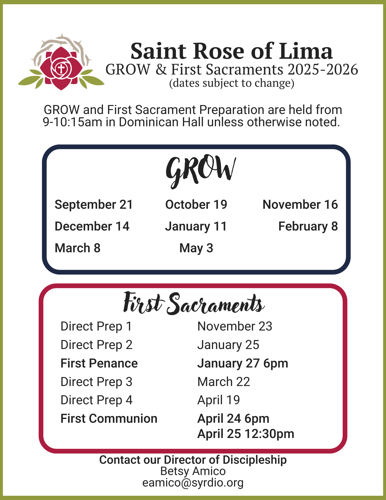 A baptized child is eligible for First Sacraments at Saint Rose after one year of faith formation (either in Catholic school or GROW), their family has been registered for at least one year, they attend Mass weekly and on Holy Days of Obligation for the entirety of their preparation (weekly sign in will be required) and they attend all parent/guardian and child meetings for direct preparation.